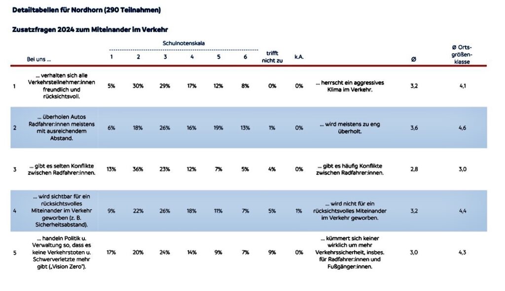 Im Oktober und November dieses Jahres hatte ich auf Einladung der SPD in der Grafschaft an drei Abendveranstaltungen in Uelsen, Nordhorn und Bad Bentheim den „Fahrradklimatest 2024“ vorgestellt und diskutiert. Neben den regionalen Erkenntnissen zur Entwicklung des Radverkehrs in allen Kommunen der Grafschaft Bentheim wurden übereinstimmend in allen(!) drei Veranstaltungen das „Miteinander im Straßenverkehr“ und die „Rücksichtnahme im Straßenverkehr“ thematisiert: Nicht nur unterschiedliche Verkehrsteilnehmer wie Radfahrer, Fußgänger und Autofahrer sollten mehr Rücksicht aufeinander nehmen. Besonders stressig wurde die Diskussion jeweils dann, wenn es um die Nutzung von „FAT-Bike“ und „e-Roller“ ging. Dabei zeigen die neuesten Ergebnisse des „Fahrradklimatests“ überhaupt keine Anzeichen für ein schlechtes „Miteinander“. Vielmehr waren die gefühlten Werte in unserer Region deutlich besser als im Bundesdurchschnitt. „Hat sich in den vergangenen Monaten so viel verändert?“, fragte ich mich.